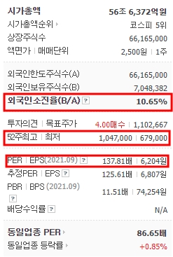 52주 최고가는 1백만47만원이고 최저가는 67만9천원이다.