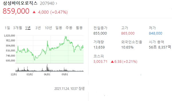 제약바이오 섹터가 주목받으면서 의약품 업종 내 시가총액이 가장 큰 삼성바이오로직스 주가가 관심종목으로 떠오르고 있다. 2021년 8월 18일 장중 104만7천원으로 최고가를 찍은 후 두달지난 10월 초에 78만원대까지 밀린바 있는 삼성바이로로직스는 최근 88만원대까지 주가를 회복하며 향후 전망에 큰 기대감이 모아지고 있다.