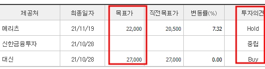 현대로템의 목표주가는 2021년 10월 11월 증권사 전망으로 봤을때 2만2천원에서 2만7천원으로 홀드와 바이를 제시하고 있다.
