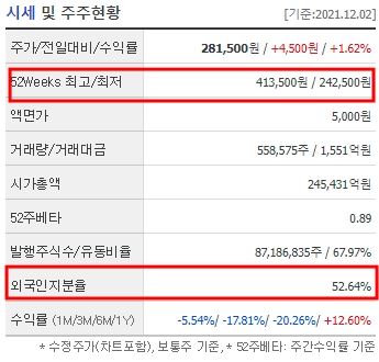 역대 최고 영업이익을 경신한데 비해 주가는 하락세를 그려 11월 30일에는 26만천원까지 주가가 하락하다가 지주사 전환을 발표하자 28만원대까지 올라서고 있다.