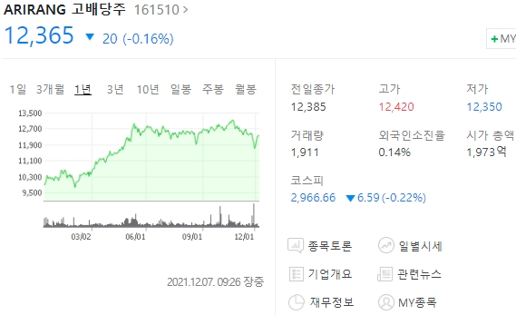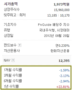 한화자산운용이 관리하는 아리랑 ARIRANG 고배당주 ETF 상장지수펀드 순자산총액 1천780억여원으로 국내 고배당주 ETF 중 큰 규모로 꼽힌다.