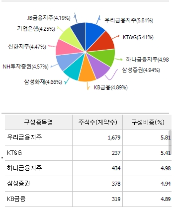 아리랑 고배당주ETF는 높은 수준의 배당이 기대되는 종목들로 매년 포트폴리오를 지속적으로 재조정 하고있는 etf로 금융과 에너지 등 가치주를 중심으로 배당성향이 높은 주식을 종목에 추가하고 있다.
