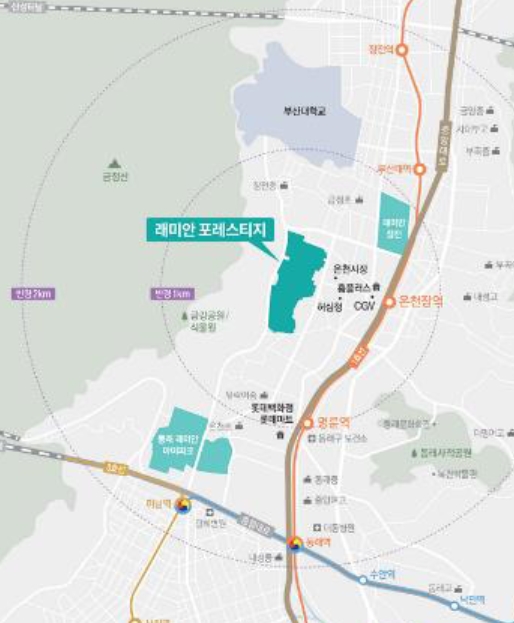 부산 온천 래미안포레스티지는 총 3개 단지로 지하 6층에서 지상 최고 35층의 36개동 메가톤급 아파트이다. 전용면적 39∼147㎡ 총 4043가구로 조성되며 이 중 조합원과 임대물량을 제외한 전용면적 49∼132㎡ 2331가구가 일반에 분양 물량이다.