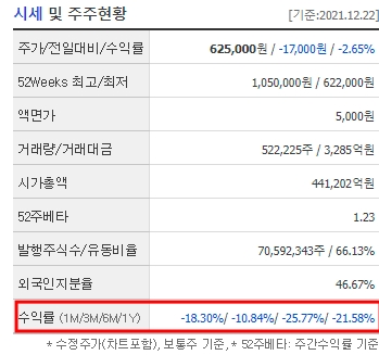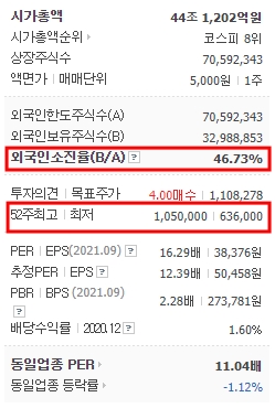 52주 최고가는 1백5만원이며 최저가는 현재 진행형으로 63만6천원을 기록하고 있다.