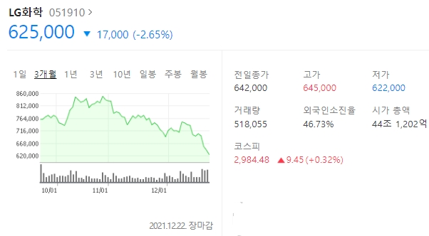 LG화학은 LG에너지솔루션 상장일인 2022년 1월 27일 이후 그 주가의 향방이 정해질것으로 보인다.