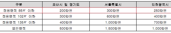 쳥약예치금은 전용85제곱미터 이하 오산시 및 경기도는 200만원, 서울시는 300만원, 인천광역시는 250만원이다.