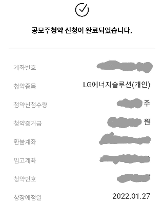 신청완료된 화면에서는 계좌번호, 청약종목 LG에너지솔루션, 청약신청수량, 청약증거금, 환불계좌, 입고계좌, 청약번호, 상장예정일인 2022년 1월 27일이 표기된다.