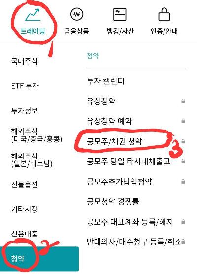1. 트레이딩 > 청약 > 공모주/채권 청약 메뉴로 이동한다.
