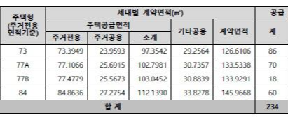 지하 1층~지상 20층 규모로 3개동이 들어서며 전용면적 73에서 84㎡ 세대면적으로 전체 234가구 규모이다.