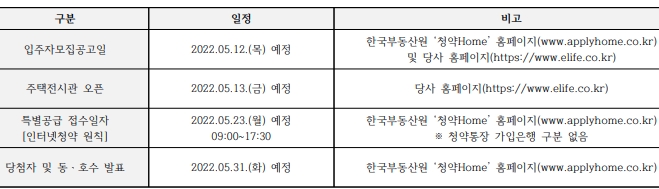분양은 2022년 5월 12일 입주자 모집공고를 시작으로 특별공급은 5월 23일부터 시작할 예정이다.