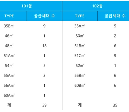 101동과 102동의 타입별 공급세대수이다.