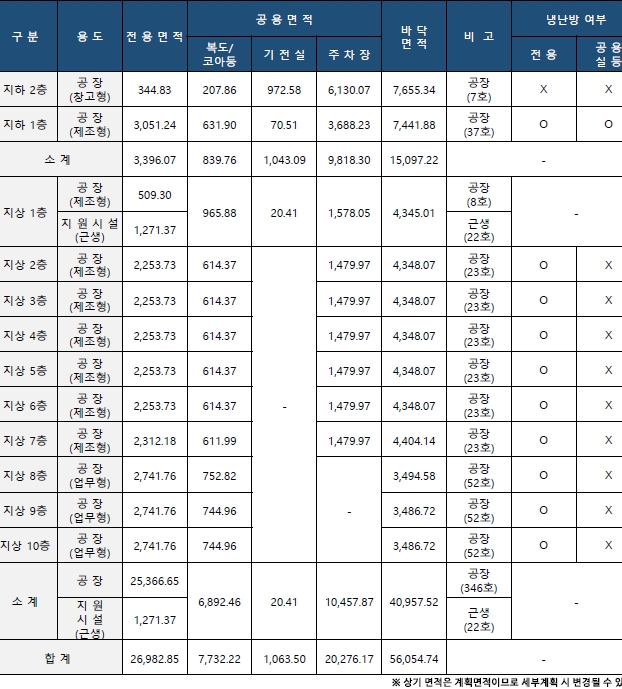지하2층에서 지상 10층의 공장, 업무형등의 용도와 전용면적, 공용면적, 바닥면적과 냉난방여부이다.