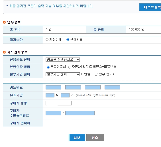 최초 1회만 출력가능하기 때문에 프린터 테스트를 미리 한 후 착오없이 출력하는것이 좋다.