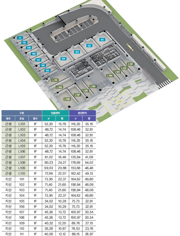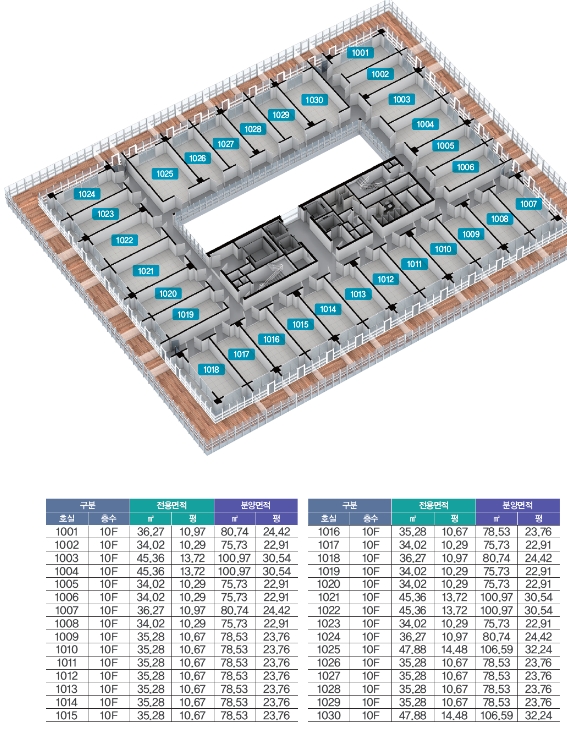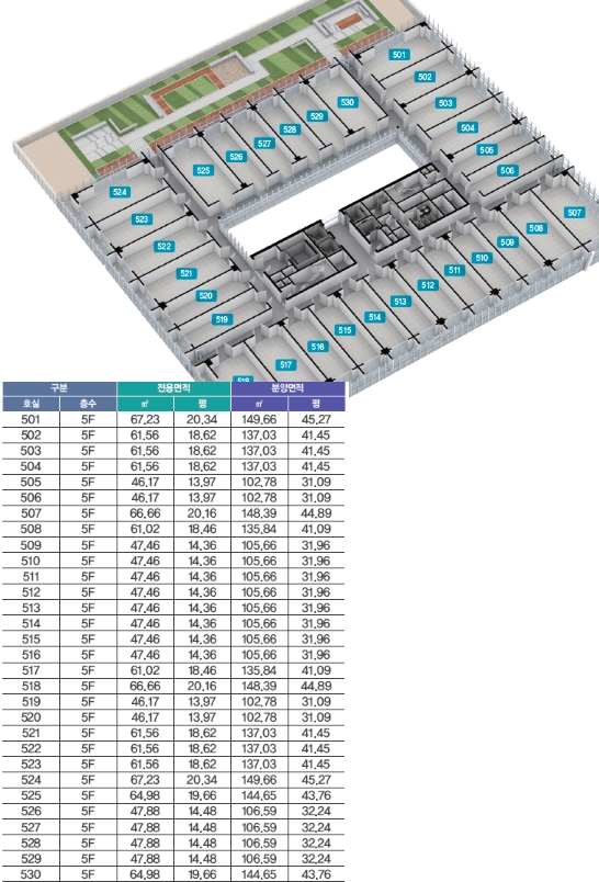 다음은 각 층별 도면과 호실별 전용면적, 분양면적이다.