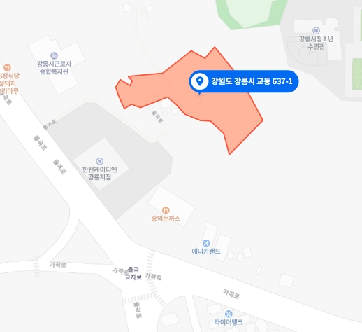강릉시 교동 637-1번지는 홍익돈까스 뒤쪽으로 인근에 근로자종합복지관과 강릉시 종합경기장이 있다.