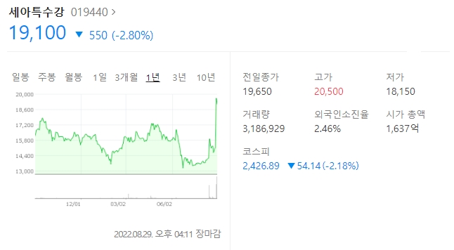 - 세아특수강 4.00% 19,100원