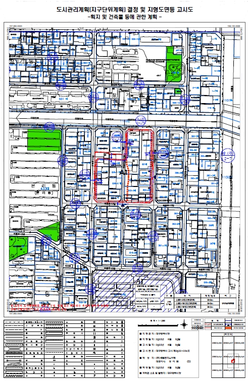 다음은 대구 달서 본리동420번지 일원 신축공사 주변 도시관리계획 결정 및 지형도면등 고시도의 획지 및 건축물 등에 대한 계획이다.