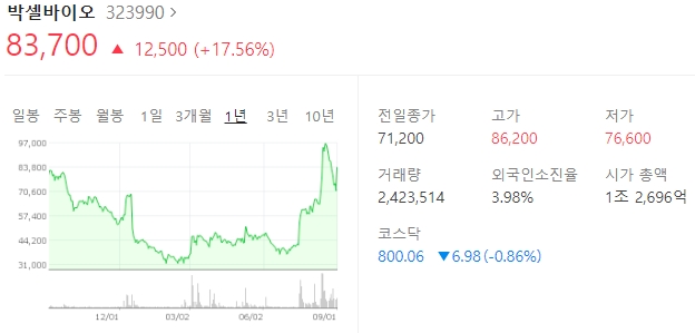 박셀바이오 주식은 시가총액 1조 2,361억원이다.