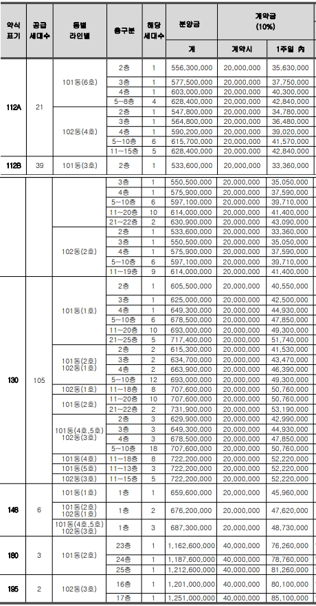 강릉 지번동 아파트 더리브퍼스티지 평형별 공급세대수 및 분양가격, 계약금이다.