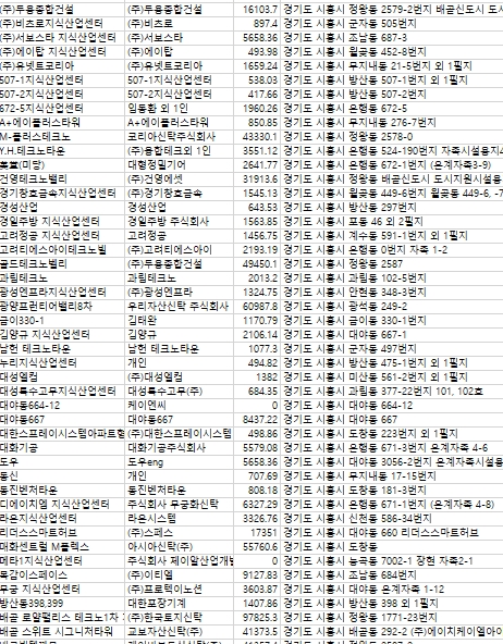 지식산업센터명, 회사명, 건축면적, 주소 순으로 표기하였다.