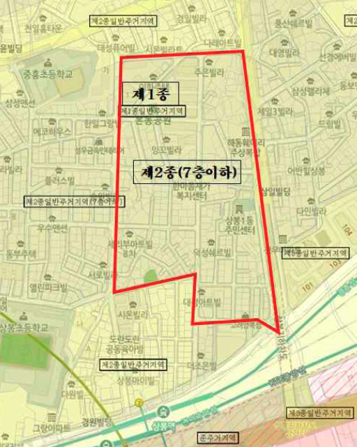 면 적 75,015㎡로 용도지역은 제1종, 제2종(7층이하)이다.