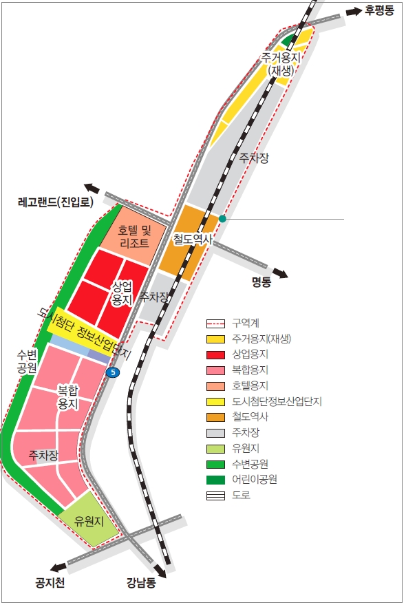 레고랜드 진입로 및 역사와 인접한 부지에 관광숙박 및 상업기능을 배치했다.