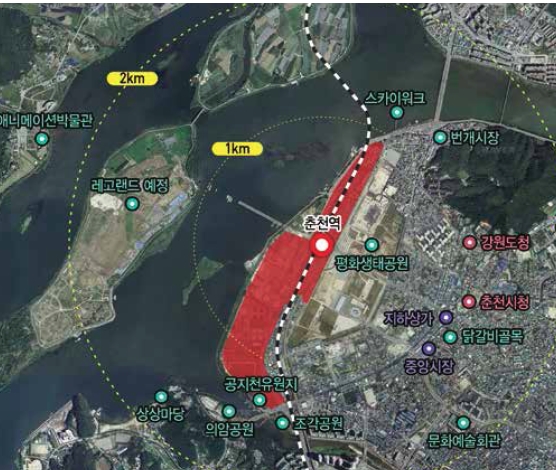 입지현황 : 현재 경춘선 종점역, 레고랜드(예정) 및 평화생태공원(구 캠프페이지) 사이 위치