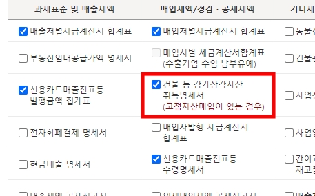 4. 입력서식 선택중 건물등 감가상각자산 취득명세서를 추가로 체크한다.