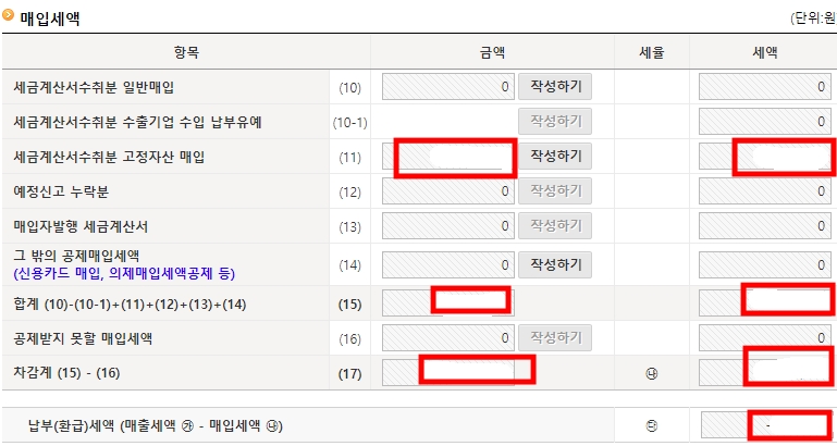 세금게산서수취분 고정자산 매입항목의 금액이 세팅되고 다른 매입세액이 없다면 납부(환급)금액에 마이너스 세액이 잡힌다.