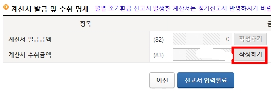 9. 계산서 발급 및 수취명세는 작성하기 버튼을 누른 후 받은 세금계산서를 확인한다.
