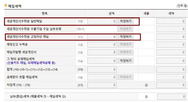 매입세액에서 세금계산서수취분 일반매입과 세금계산서수취분 고정자산 매입을 채우면 된다.