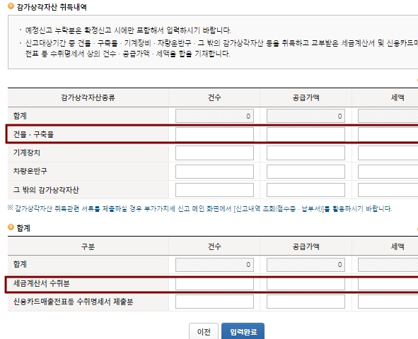이전의 일반매입작성분을 그대로 건물, 구축물의 건수, 공급가액, 세액을 기입한다.