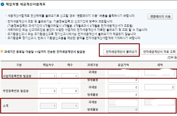 매입처별 세금계산서 합계표에서 전자세금계산서 불러오기 버튼을 눌러 자동으로 내용을 채운다.