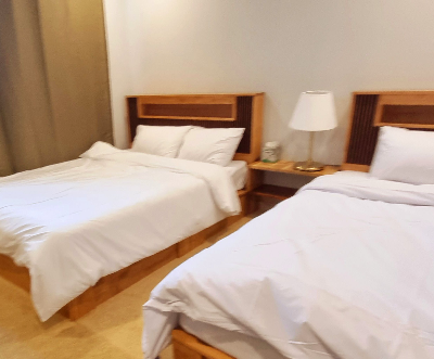 주위가 산과 마을이 있는 곳이어서 그런지 눈에 확 띄고 비교적 높은 지대에 있어서 웅장해 보이는 단독 건물이다. 앞에 넓은 데크가 있어서 더 멋스러워 보였다. 객실은 현대적이면서도 아늑한 느낌을 주는 호텔식 침대와 침구가 있었다.