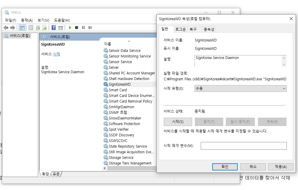 제어판>관리도구>서비스 에서 signkoreaWD 서비스명을 찾아 오른쪽 버튼을 누르면 속성이 나타나는데,