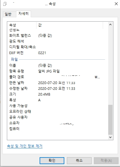 사진파일을 알씨등 뷰어프로그램으로 열고 디지털카메라정보를 눌러보면