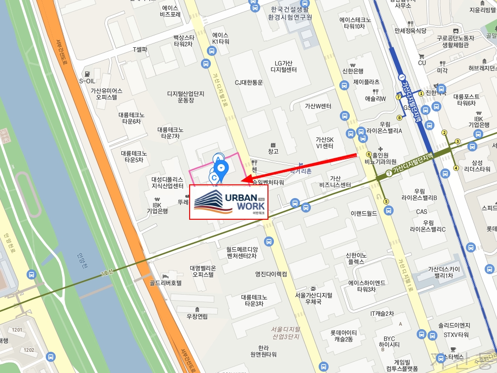 가산어반워크는 가산디지털단지역에서 도보 3~4분 거리에 위치한 초역세권에 위치한다.
